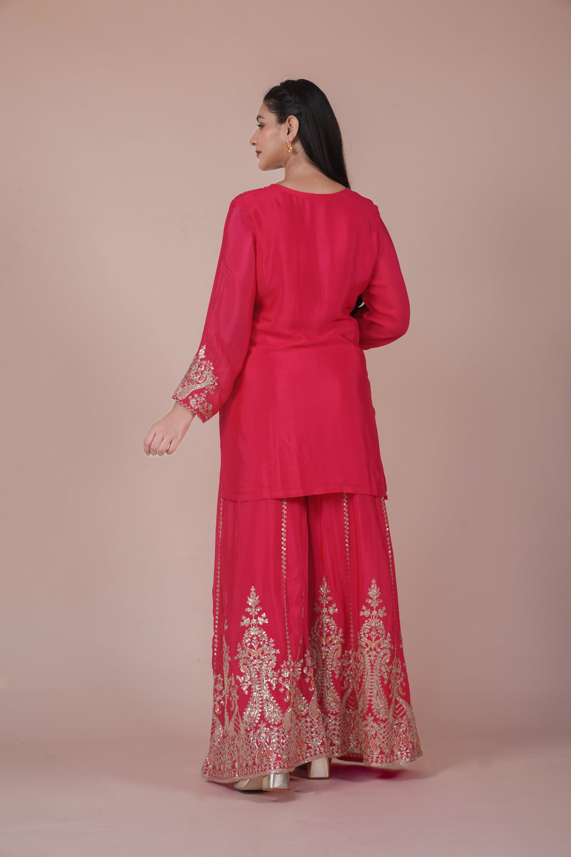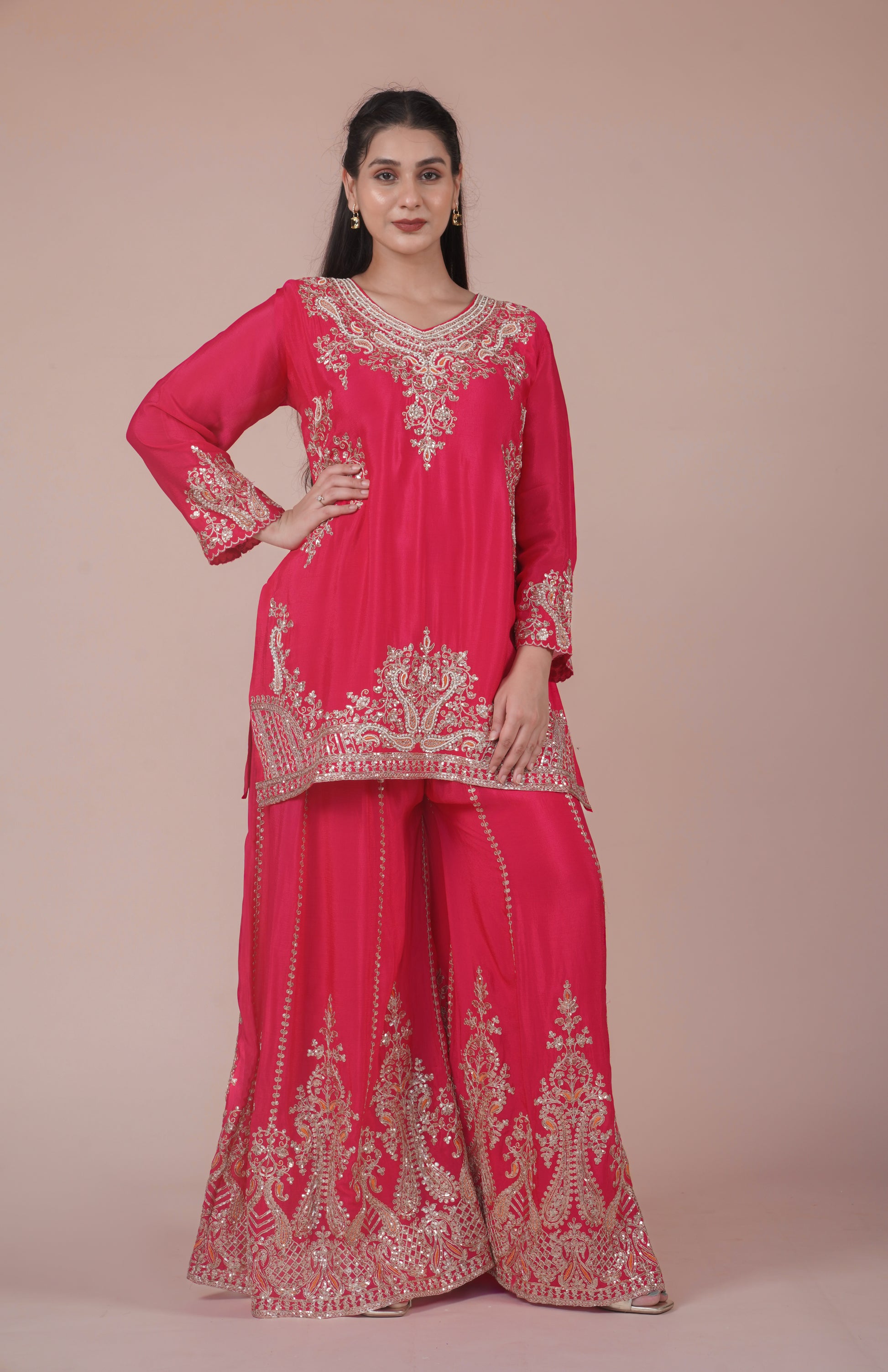 Make a lasting impression with the Adaa Sharara Set, a masterpiece of traditional craftsmanship and refined style. This fully embroidered ensemble features a beautifully detailed kurta paired with a flared sharara, both adorned with intricate embroidery that adds depth, texture, and undeniable charm.