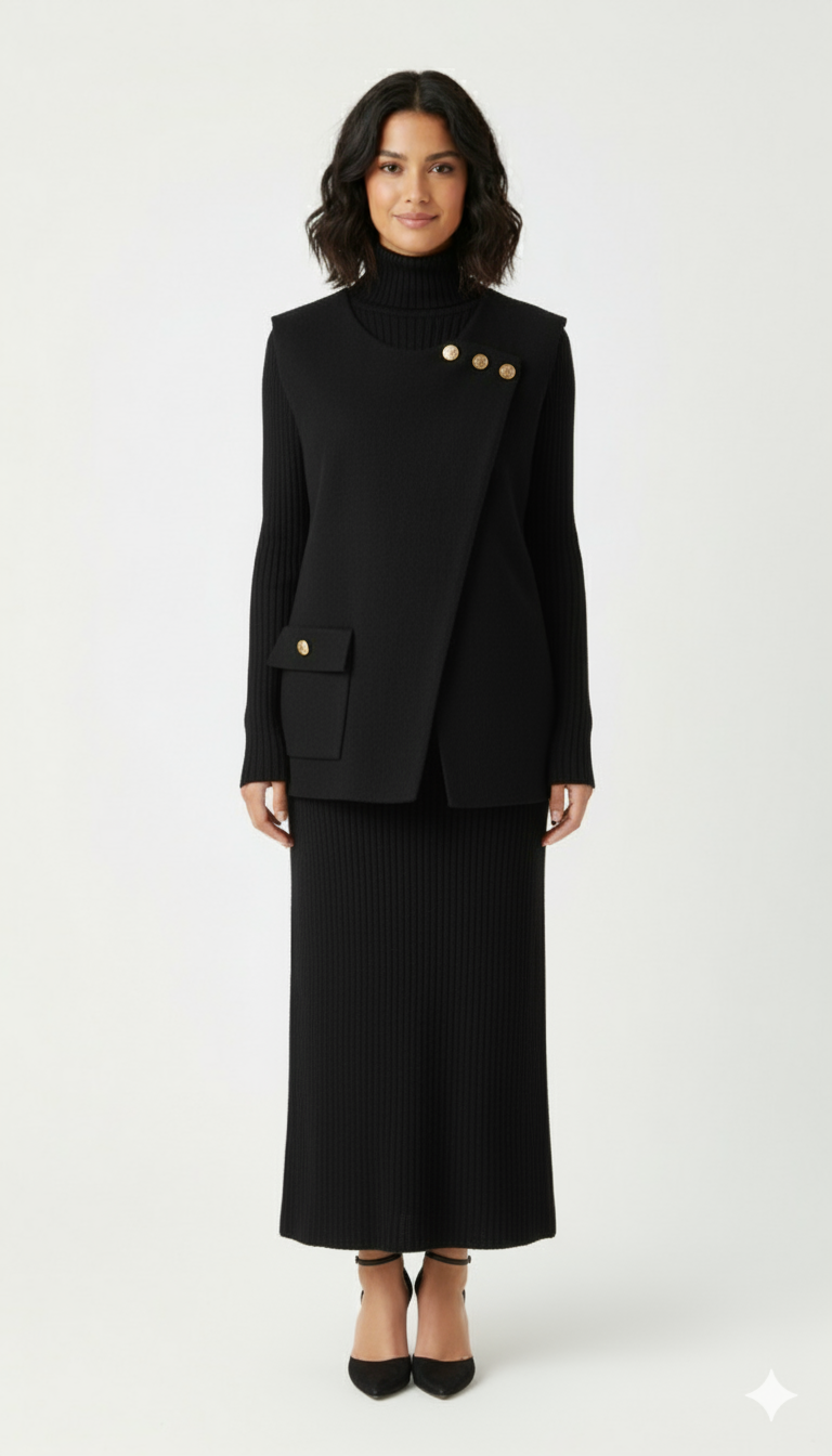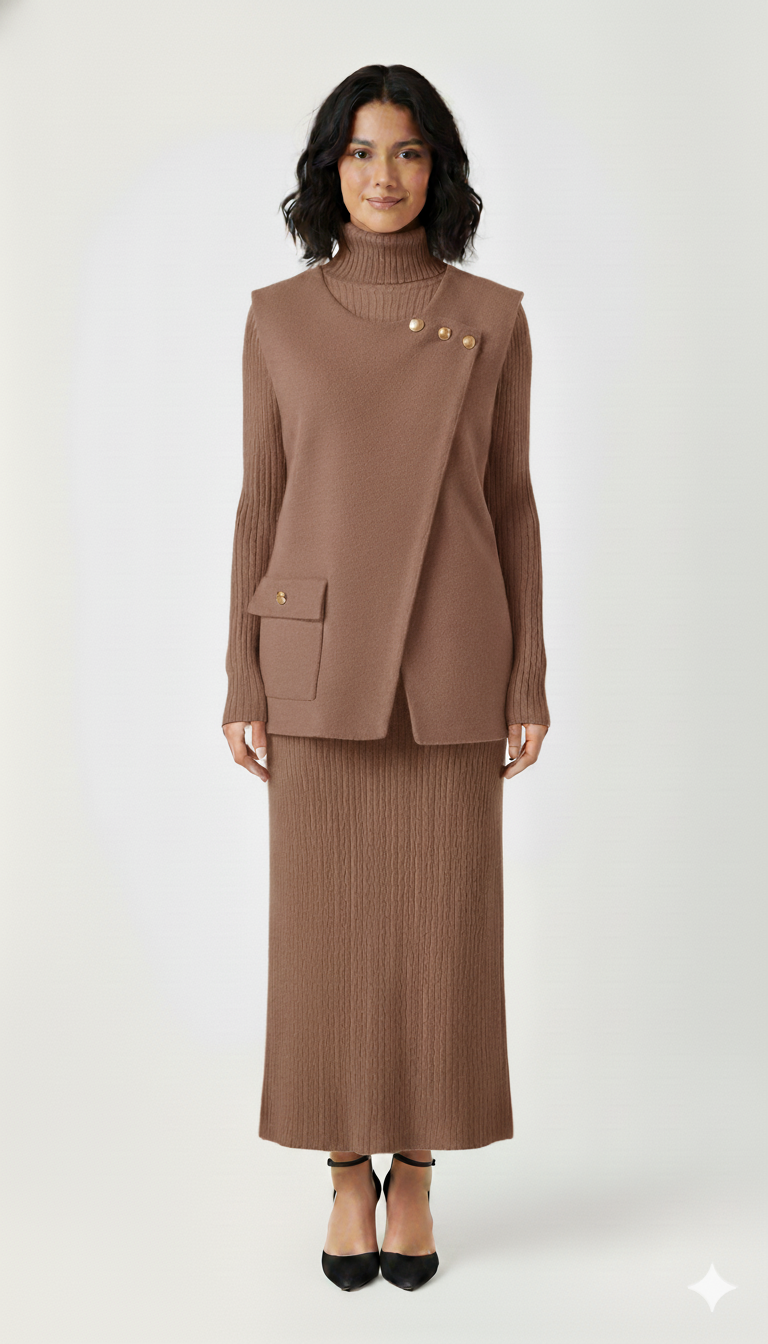 Elevate your winter style with the Alpine Set, a timeless co-ord that blends warmth with understated sophistication. Featuring a ribbed turtleneck knit top layered with an asymmetrical overlay detailed with gold-tone buttons and a sleek flap pocket, it’s designed for both comfort and structure. The matching ribbed skirt flows effortlessly to a midi length, creating a flattering, elongated silhouette.