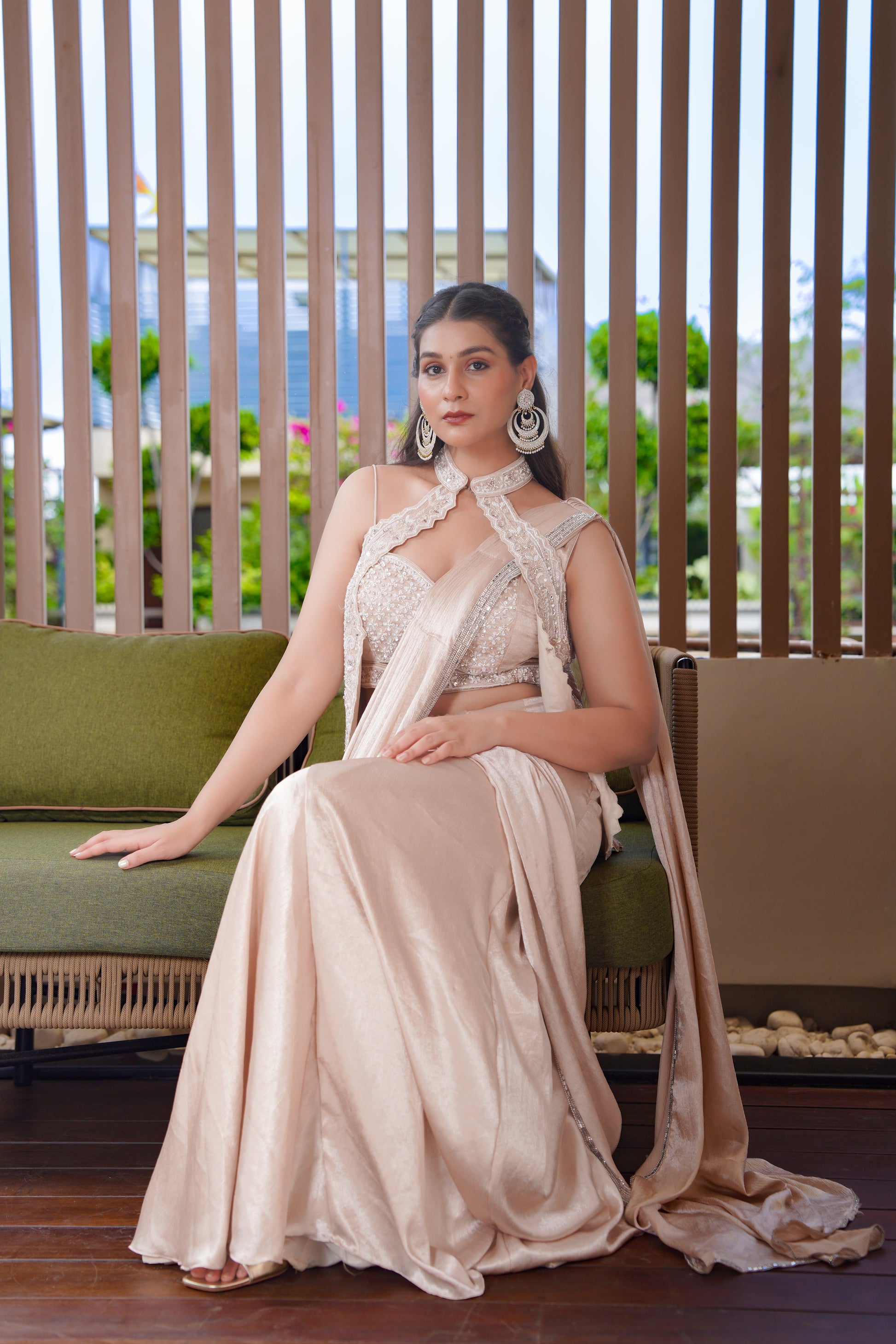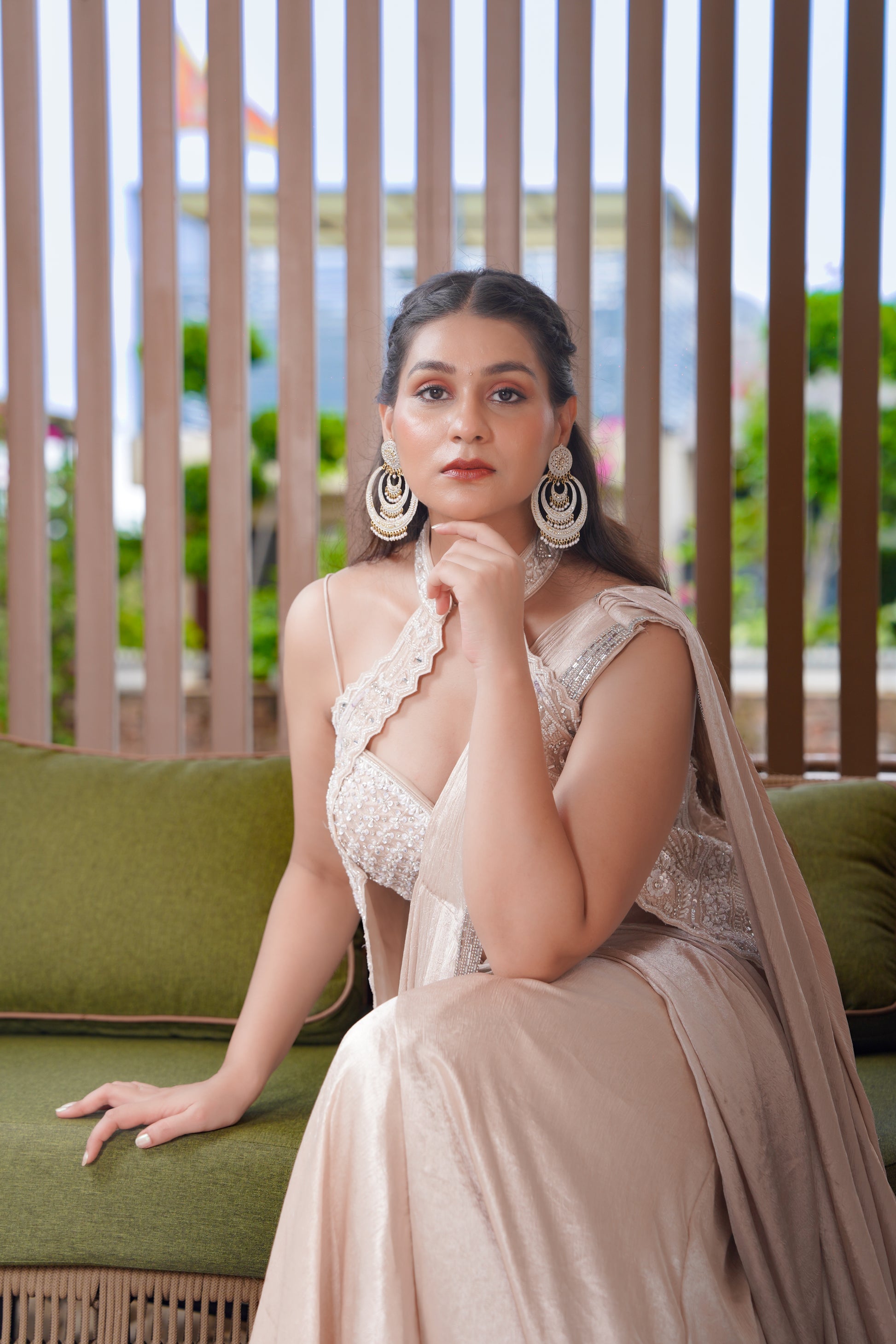 Gracefully bold and undeniably regal, the Anaya Saree is a modern take on timeless tradition. Crafted in a lustrous champagne-toned fabric with a fluid, metallic sheen, this saree flows effortlessly, creating a silhouette that is both sophisticated and statement-making.