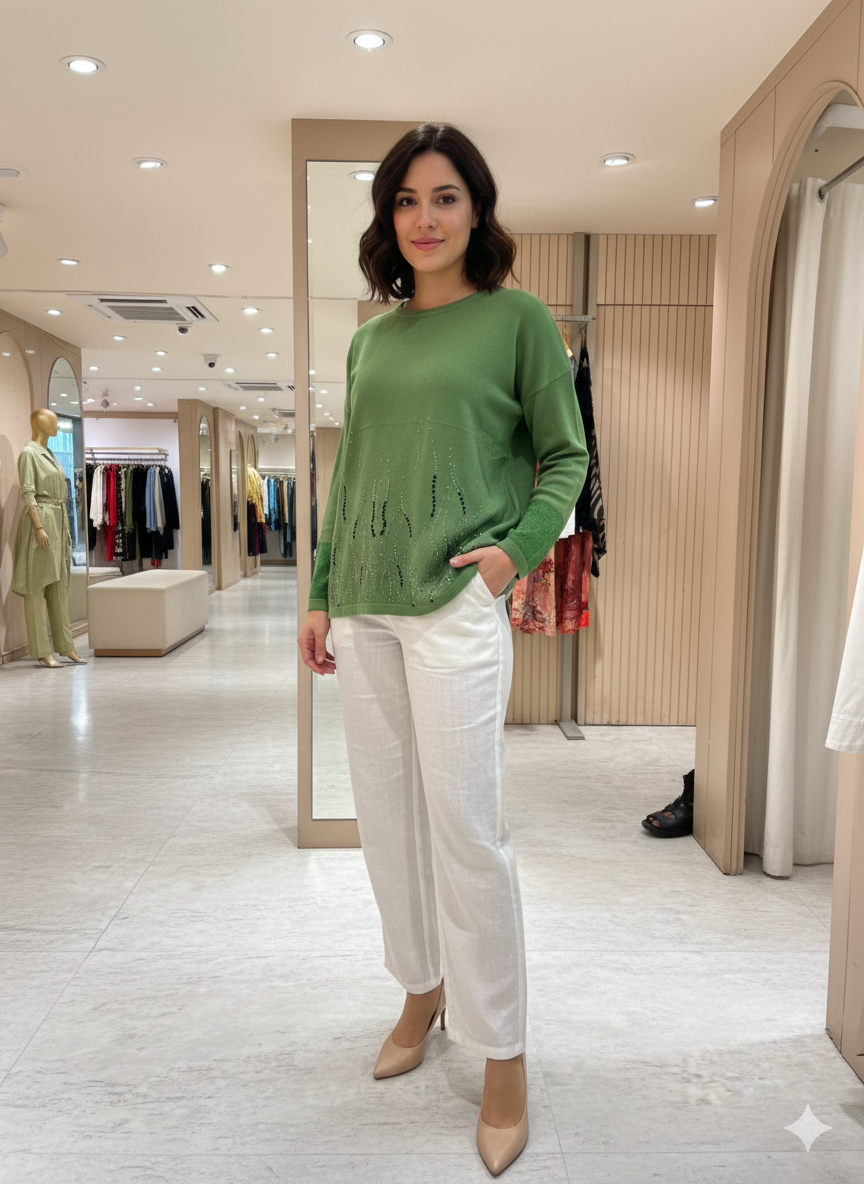 A refreshing take on everyday elegance, the Blush Knit Top features a soothing green hue that instantly brightens your look. Crafted in a soft, breathable knit, it’s detailed with delicate tonal embellishments that cascade gracefully from the front — adding a touch of subtle shimmer. The relaxed fit and drop shoulders make it effortlessly chic and comfortable for all-day wear. Perfectly paired with white trousers or denim for a refined yet laid-back statement.