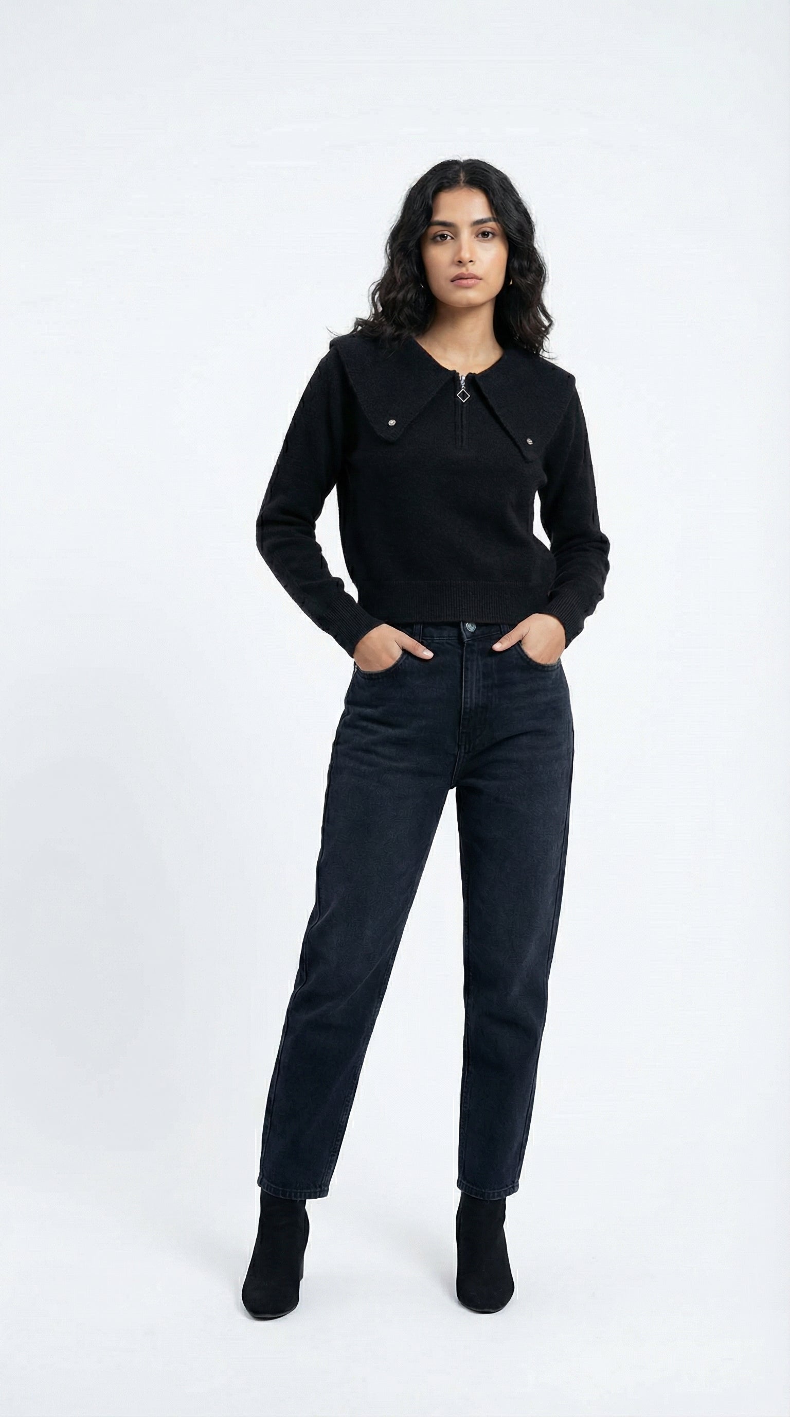 A functional quarter-zip closure allows for customizable styling—zip it up for a cozy turtleneck look or wear it open to show off a simple necklace. The slightly cropped silhouette pairs perfectly with high-waisted denim (as shown) or tailored trousers.