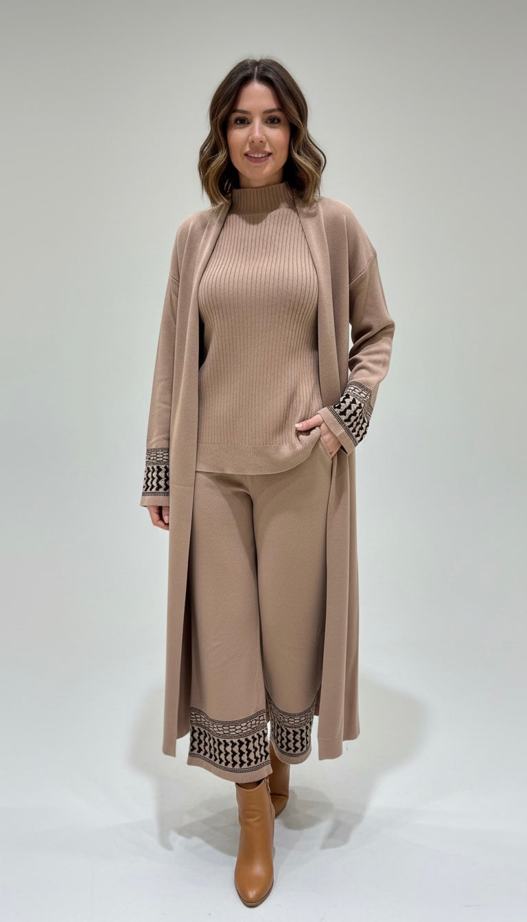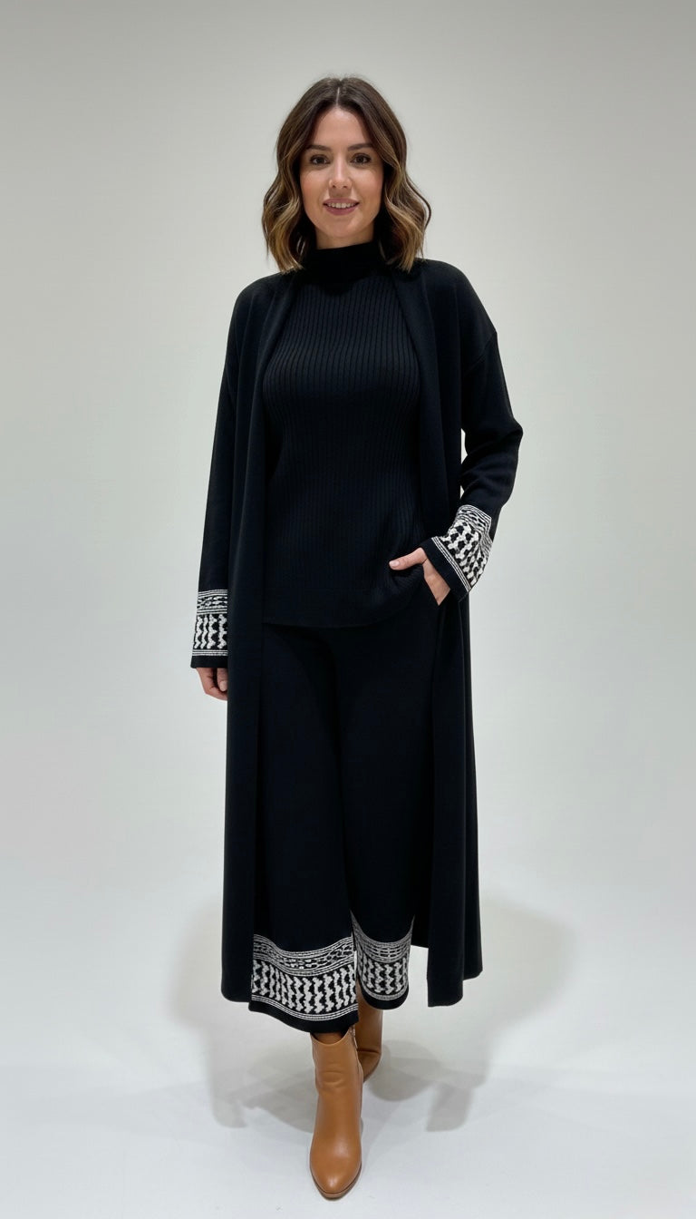 The look features a ribbed mock-neck top for a sleek base, paired with relaxed wide-leg knit culottes for effortless movement. It’s finished with a dramatic floor-sweeping duster cardigan. The striking geometric patterns on the cuffs and hemline add a touch of global-chic sophistication, making this set perfect for a weekend getaway or a stylish day at home.