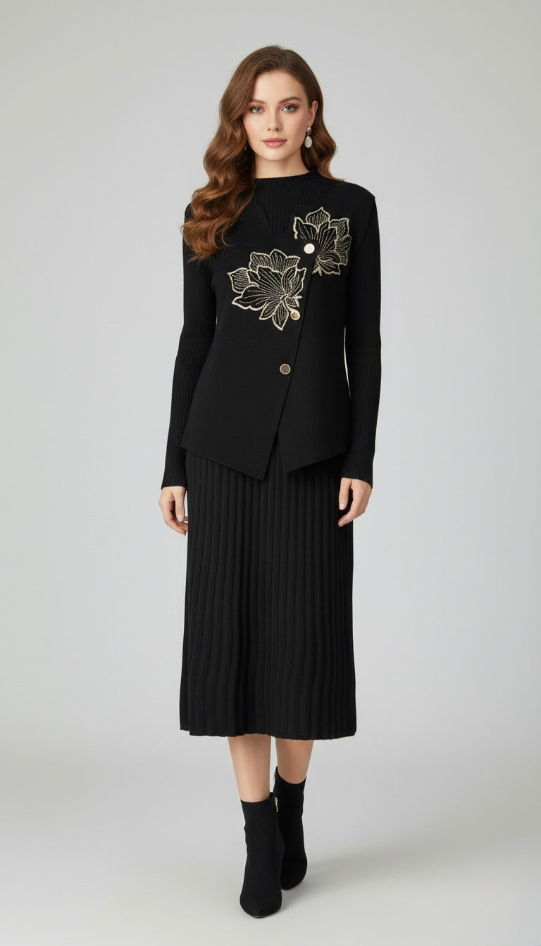 Exude polished femininity and artistic elegance with our Floral Embroidered Knit Set, a beautifully matched ensemble designed for comfort and distinctive style. This fine-gauge, ribbed knit set, featuring stunning embroidery, provides an instant, luxurious look that transitions effortlessly from day to evening.