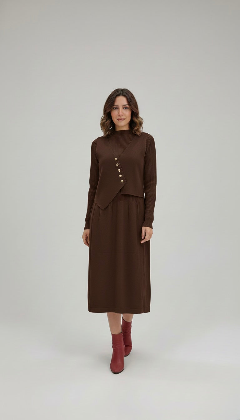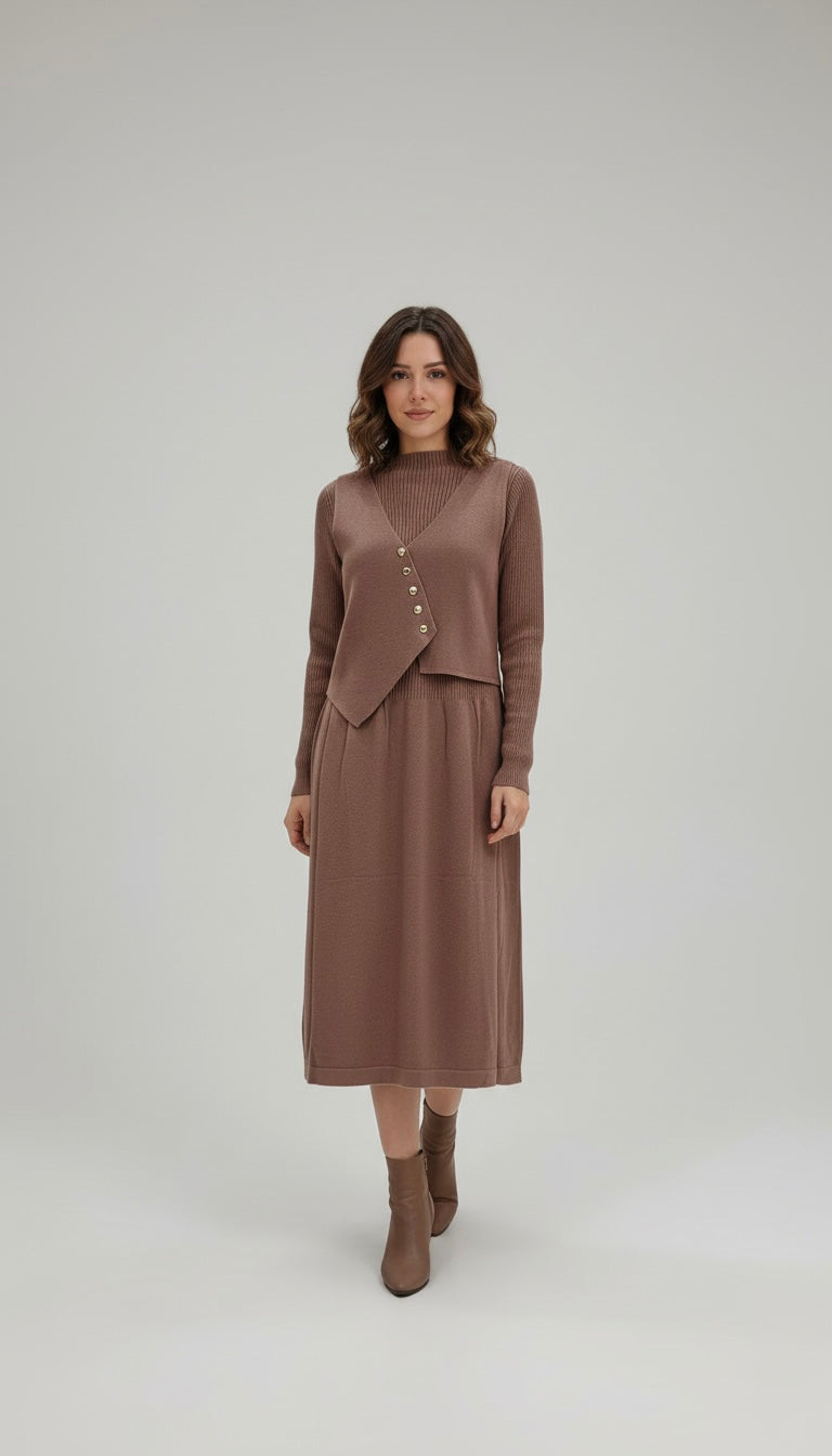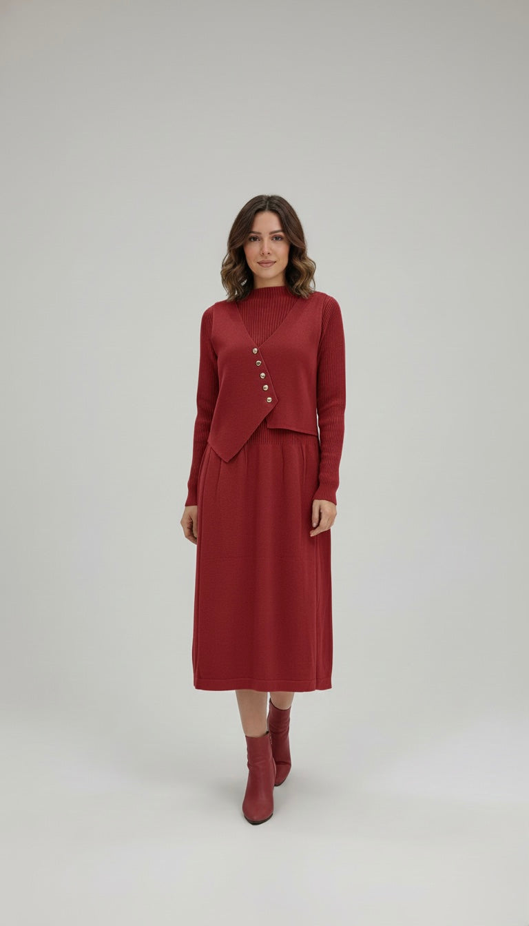 Description: Master the art of winter layering with the Iceweave Dress. This stunning midi dress combines the warmth of a ribbed mock-neck sweater with the structural elegance of a tailored vest overlay. The standout feature is the asymmetrical bodice, fastened with a row of gold-tone buttons that draw the eye and define the waist.