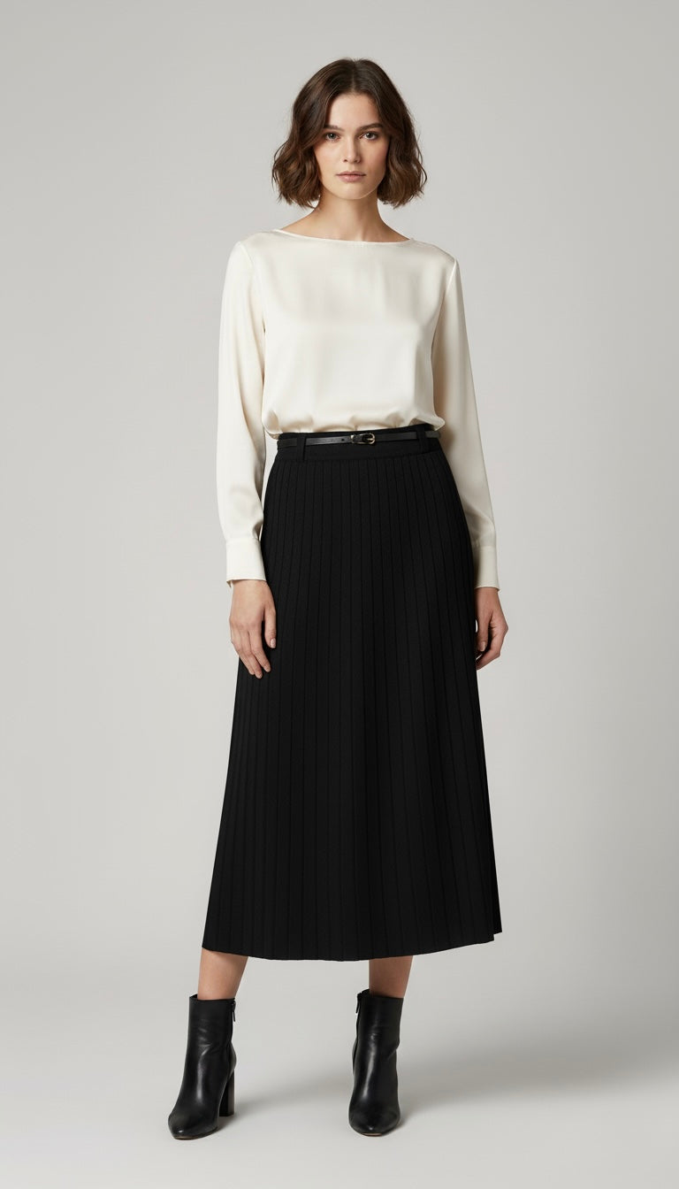 The Maison Knitwear Skirt is a timeless piece that blends warmth, comfort, and sophistication. Crafted in soft ribbed knit fabric, it features a flattering A-line silhouette that drapes beautifully with every step. The mid-length design makes it versatile for both work and casual outings, while the subtle pleat-like texture adds refined dimension.