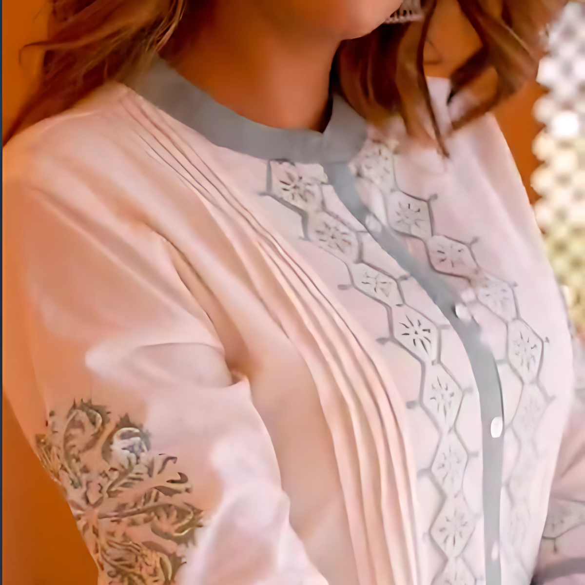 The intricate embroidery along the neckline, sleeves, and front panel adds a sophisticated dimension, making it an ideal choice for casual gatherings, office wear, or festive occasions.