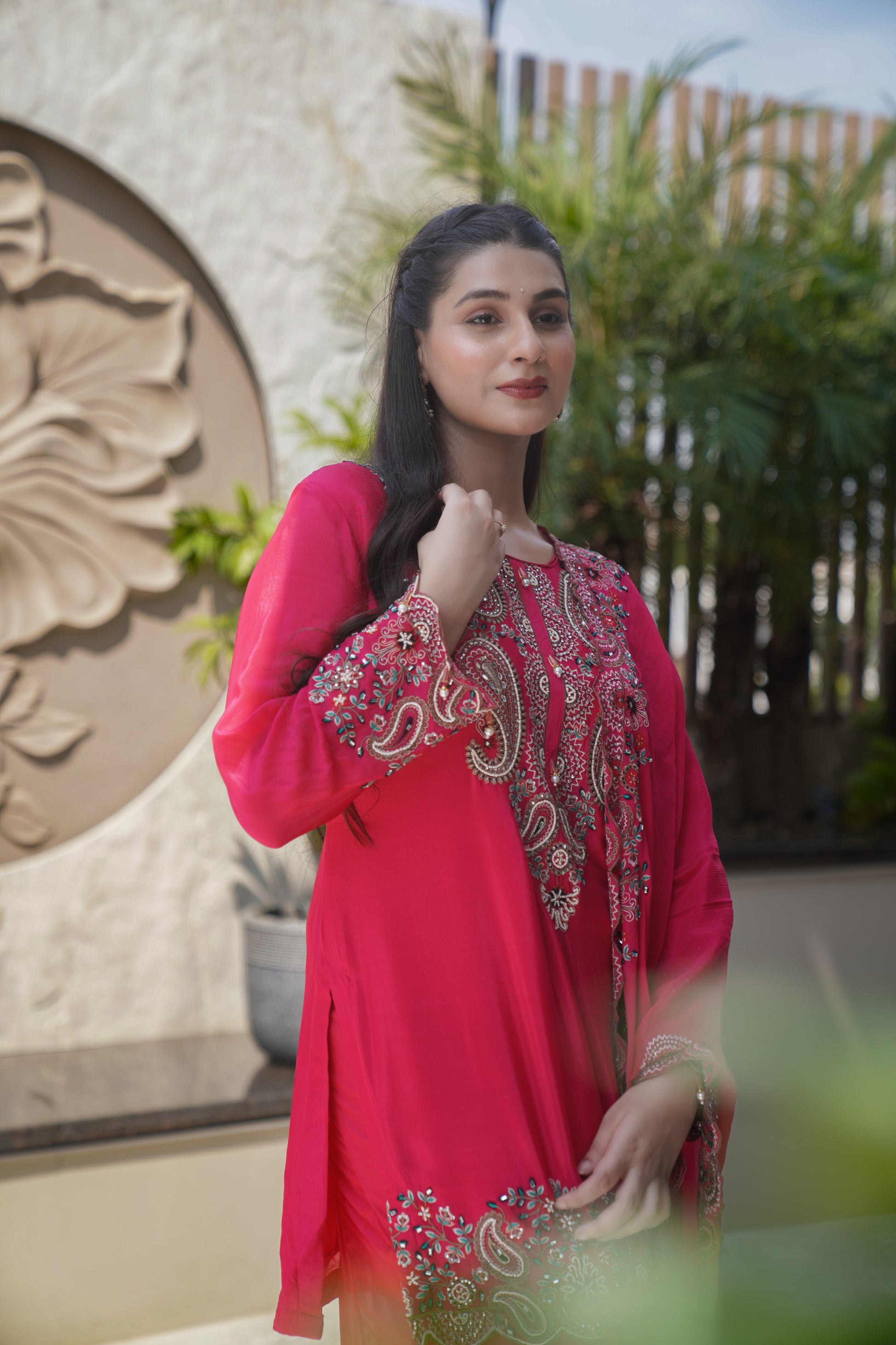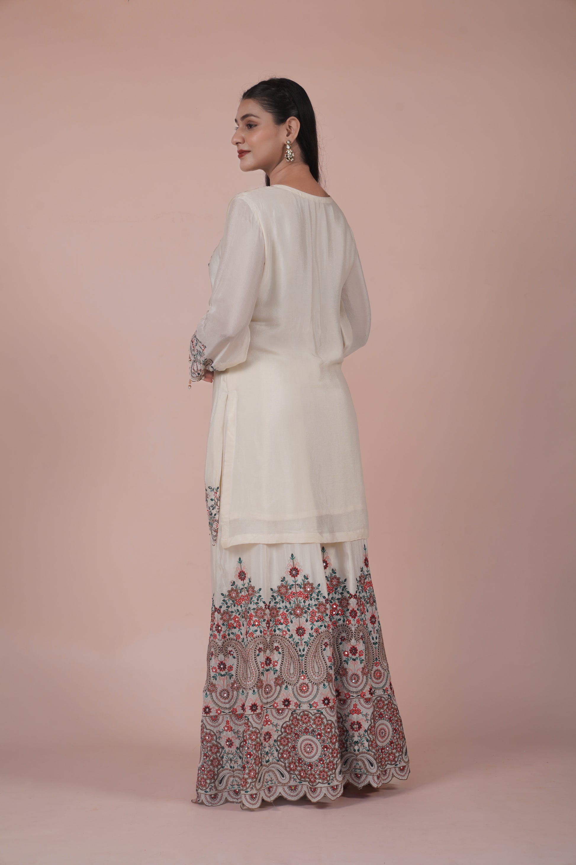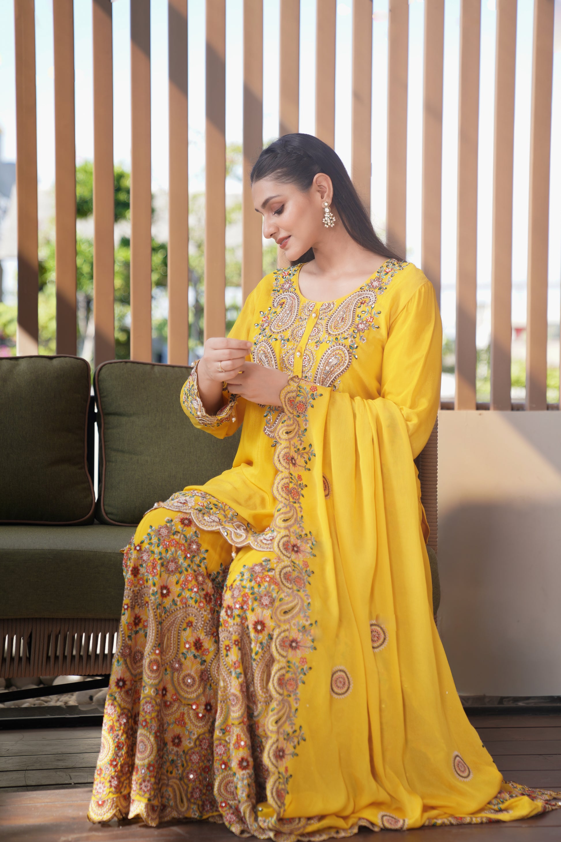 Designed for grand celebrations, the set blends traditional craftsmanship with a touch of contemporary flair. The flowing silhouette of the sharara adds grace with every step, while the embellished dupatta brings in a regal charm, perfect for mehendi, sangeet, or festive gatherings.