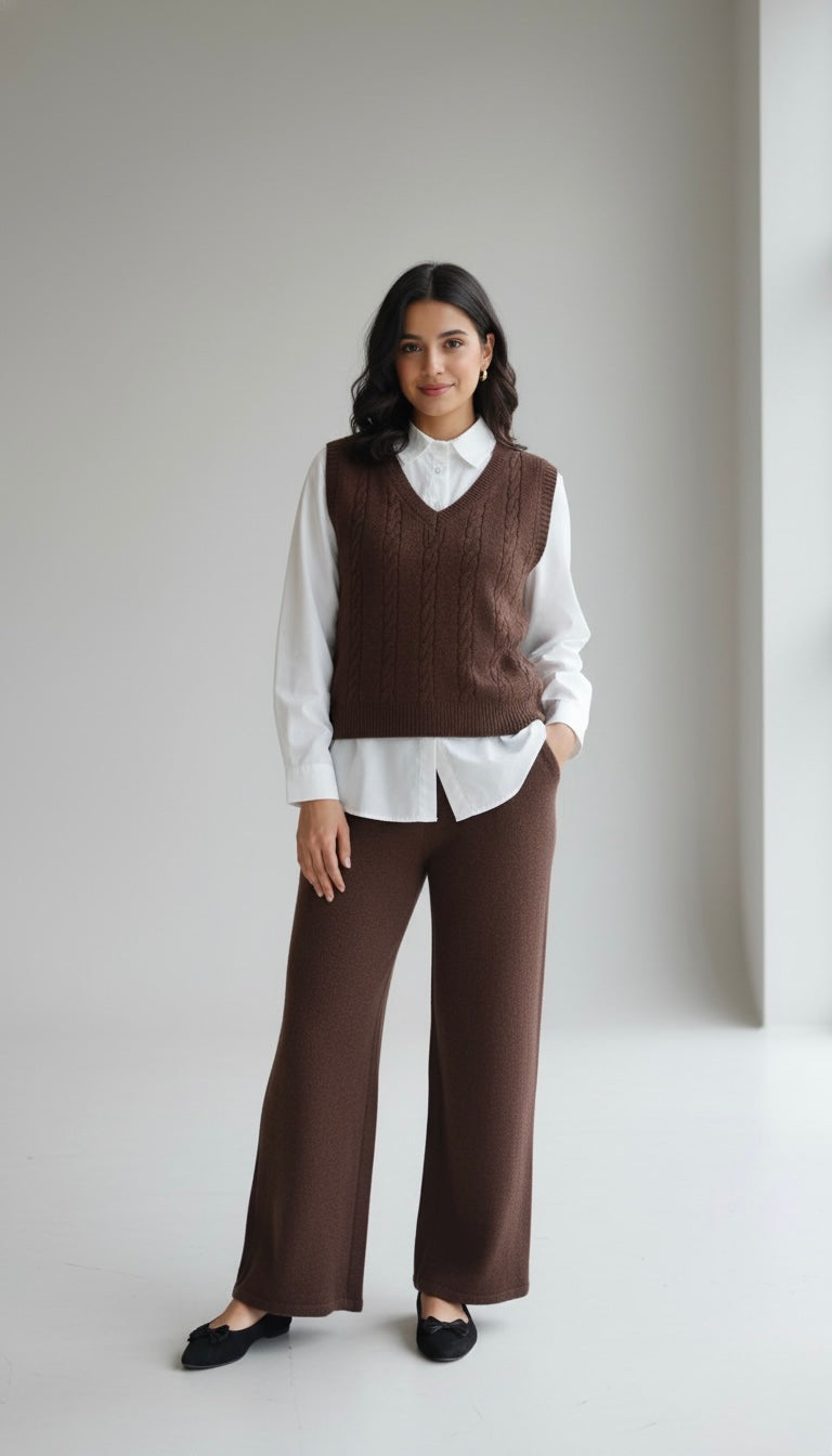 The sleeveless cable-knit vest adds a classic touch with its V-neckline and textured detailing, perfectly layered over the crisp white shirt for a clean, sophisticated look. The matching wide-leg knit pants offer unbeatable comfort while maintaining a tailored, polished feel—ideal for both work and relaxed weekend outings.
