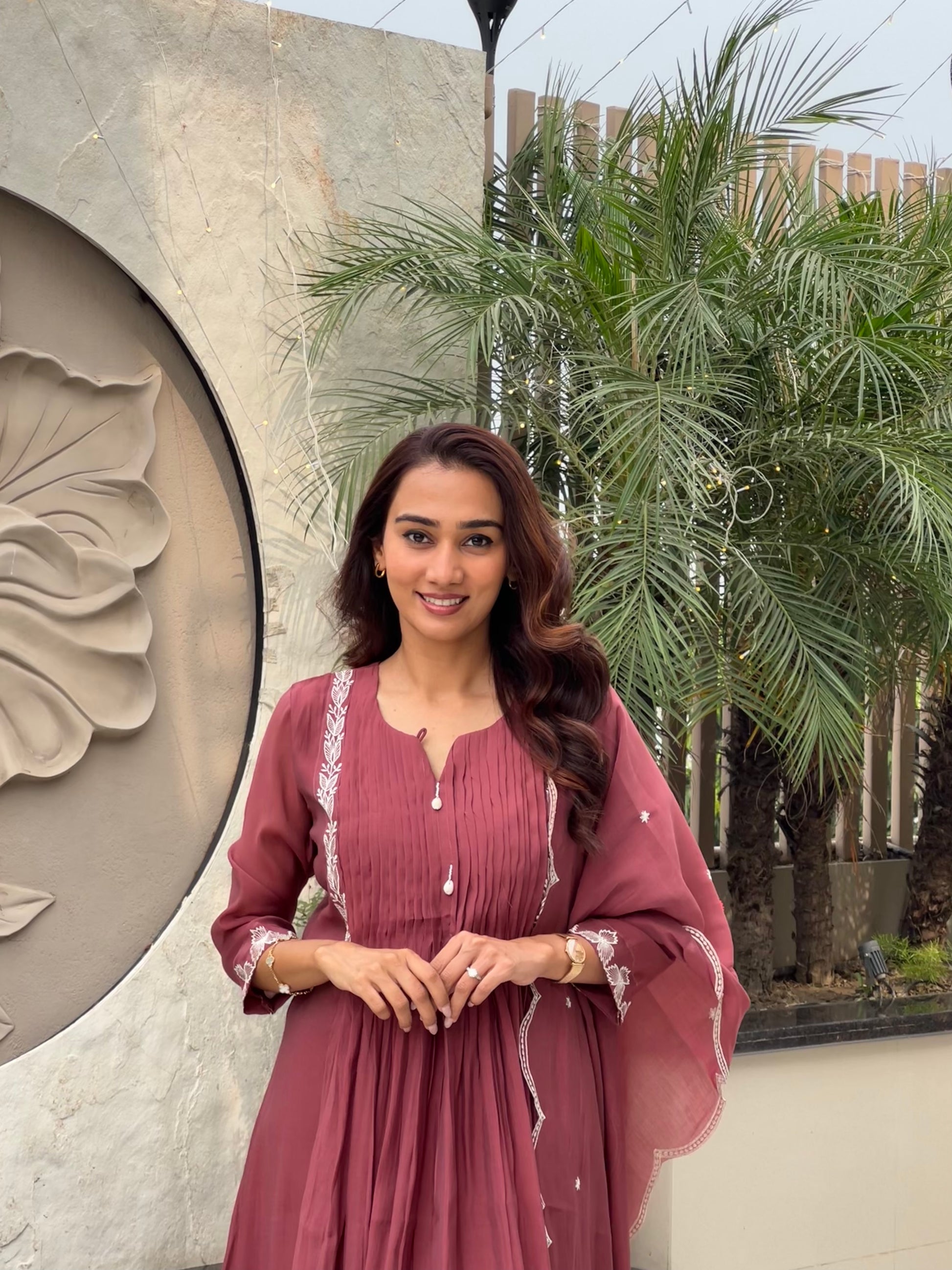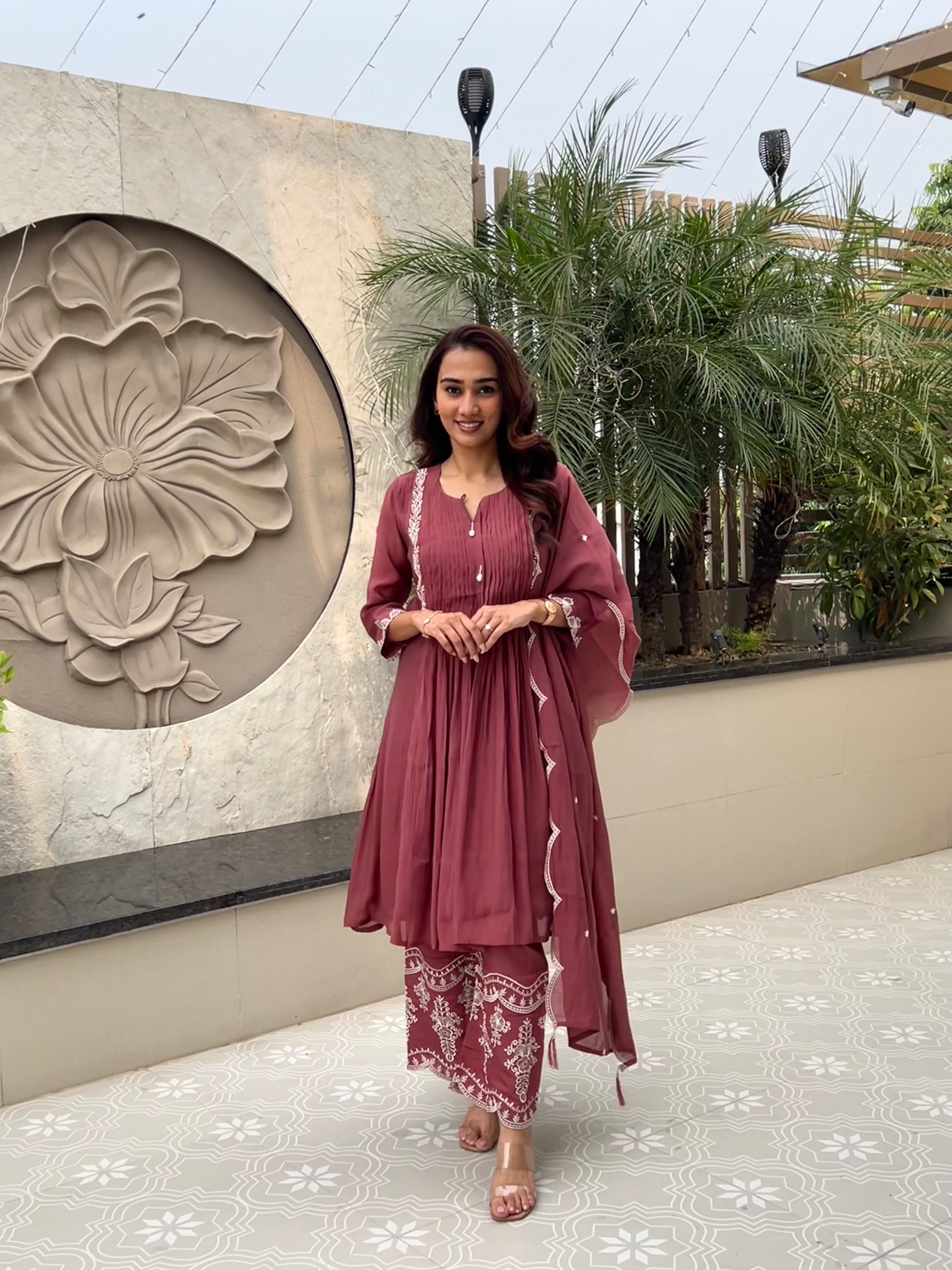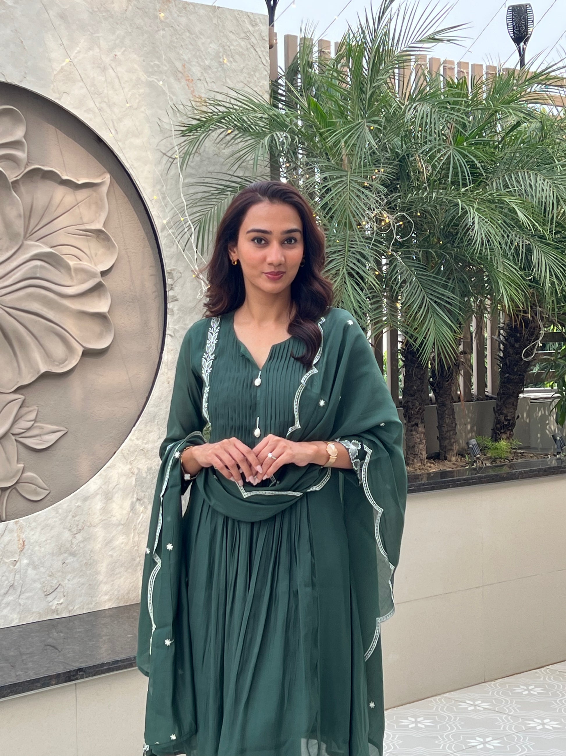 Graceful, timeless, and effortlessly feminine — the Rajsi Ruh Set captures the beauty of understated elegance. Crafted in soft, flowy georgette, this ensemble features a delicately pleated kurta adorned with subtle thread and mirror embroidery along the neckline and sleeves. The relaxed A-line silhouette flatters every body type while offering all-day comfort.