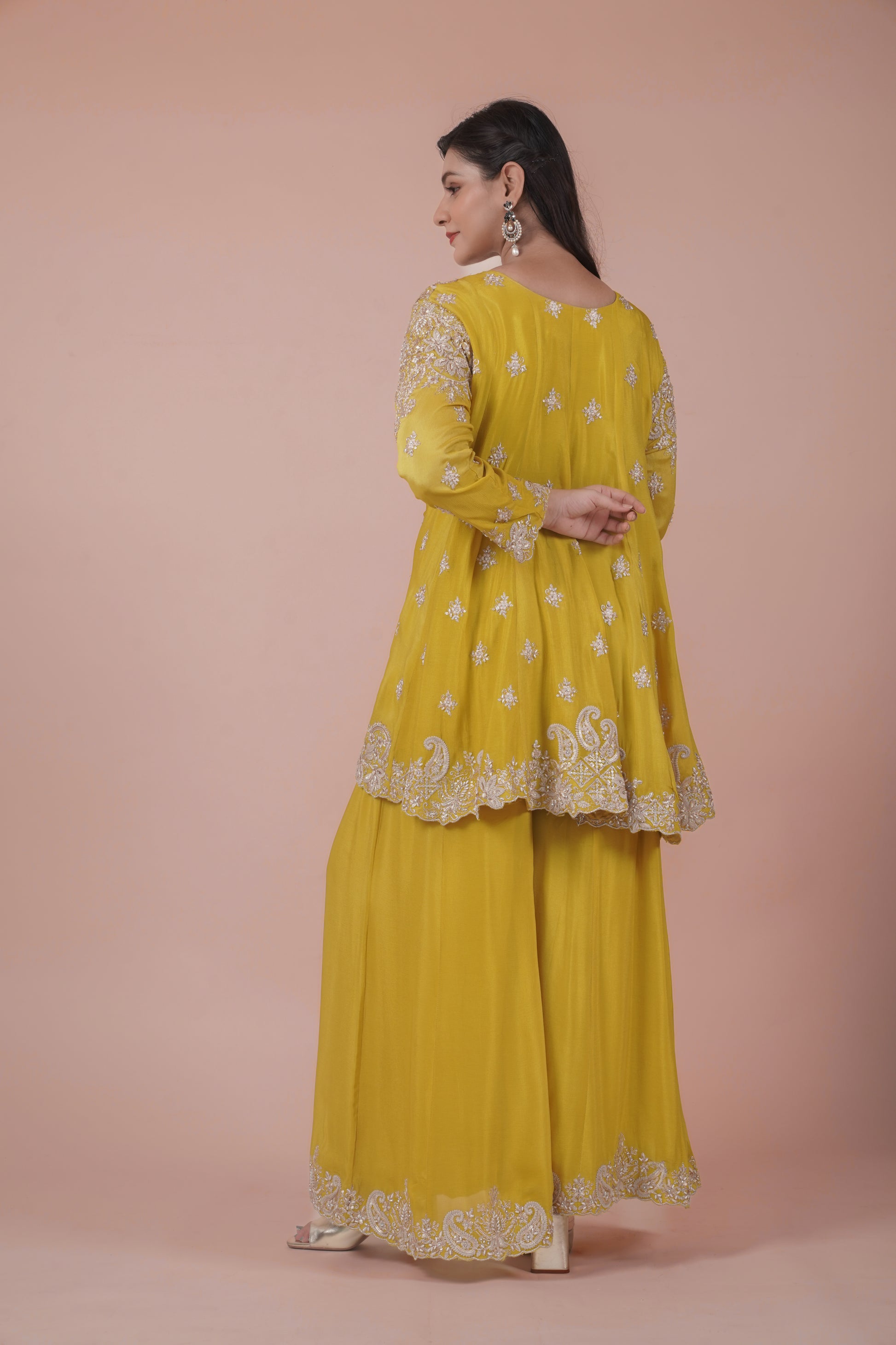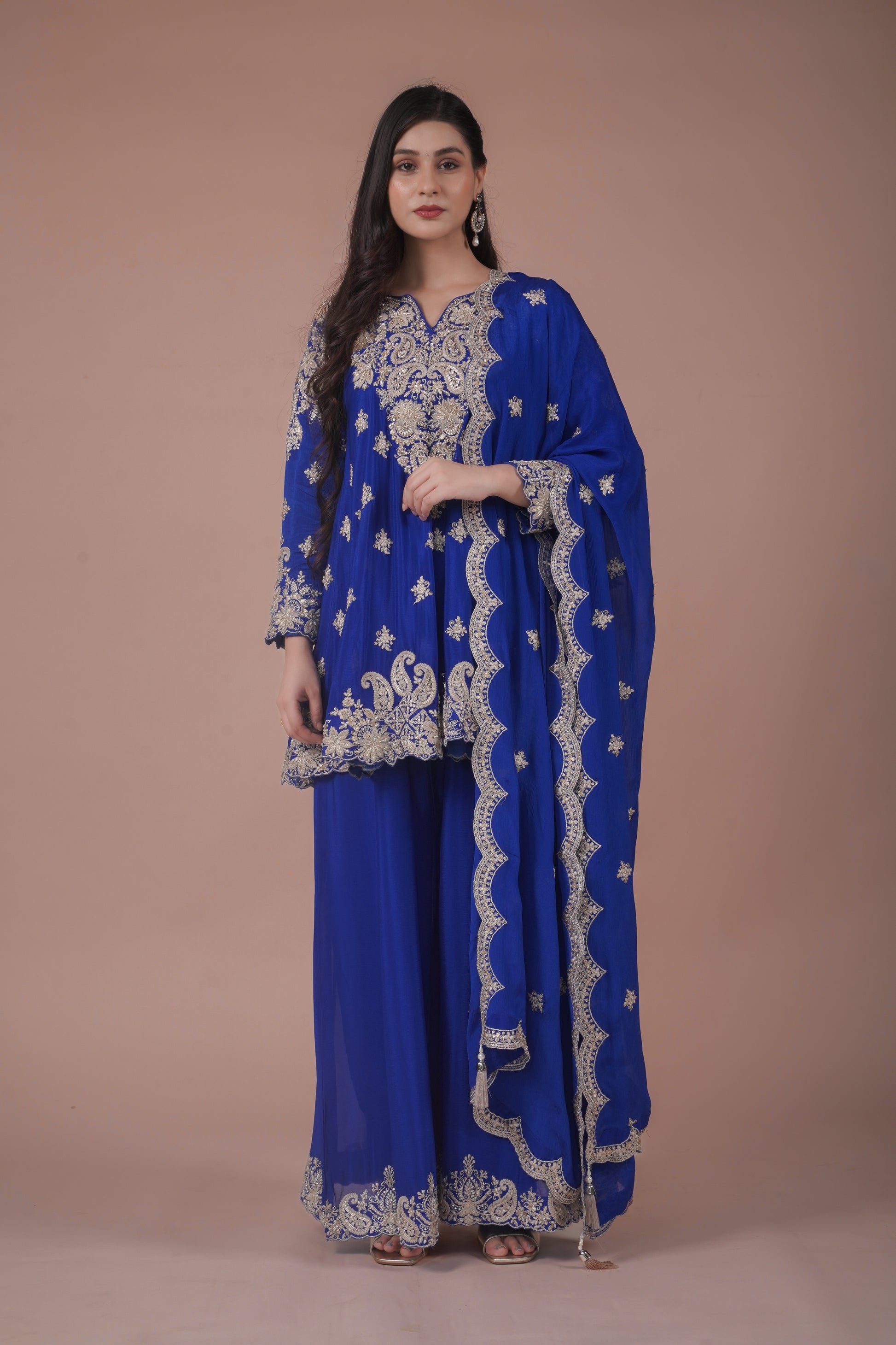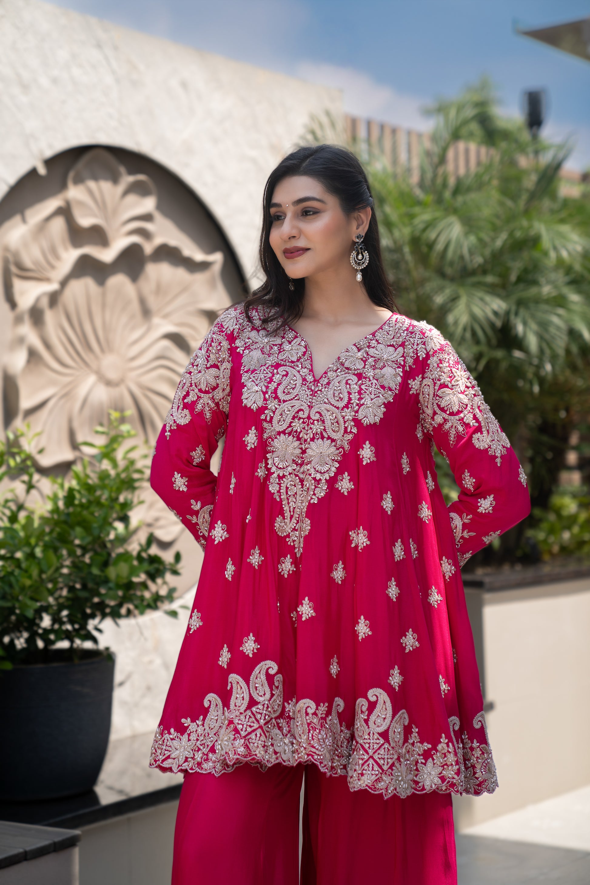 This stunning ensemble features a short Anarkali paired with a flowy sharara, both fully embroidered with intricate detailing that reflects timeless craftsmanship. Designed for celebrations, this set captures the richness of tradition with a contemporary twist.