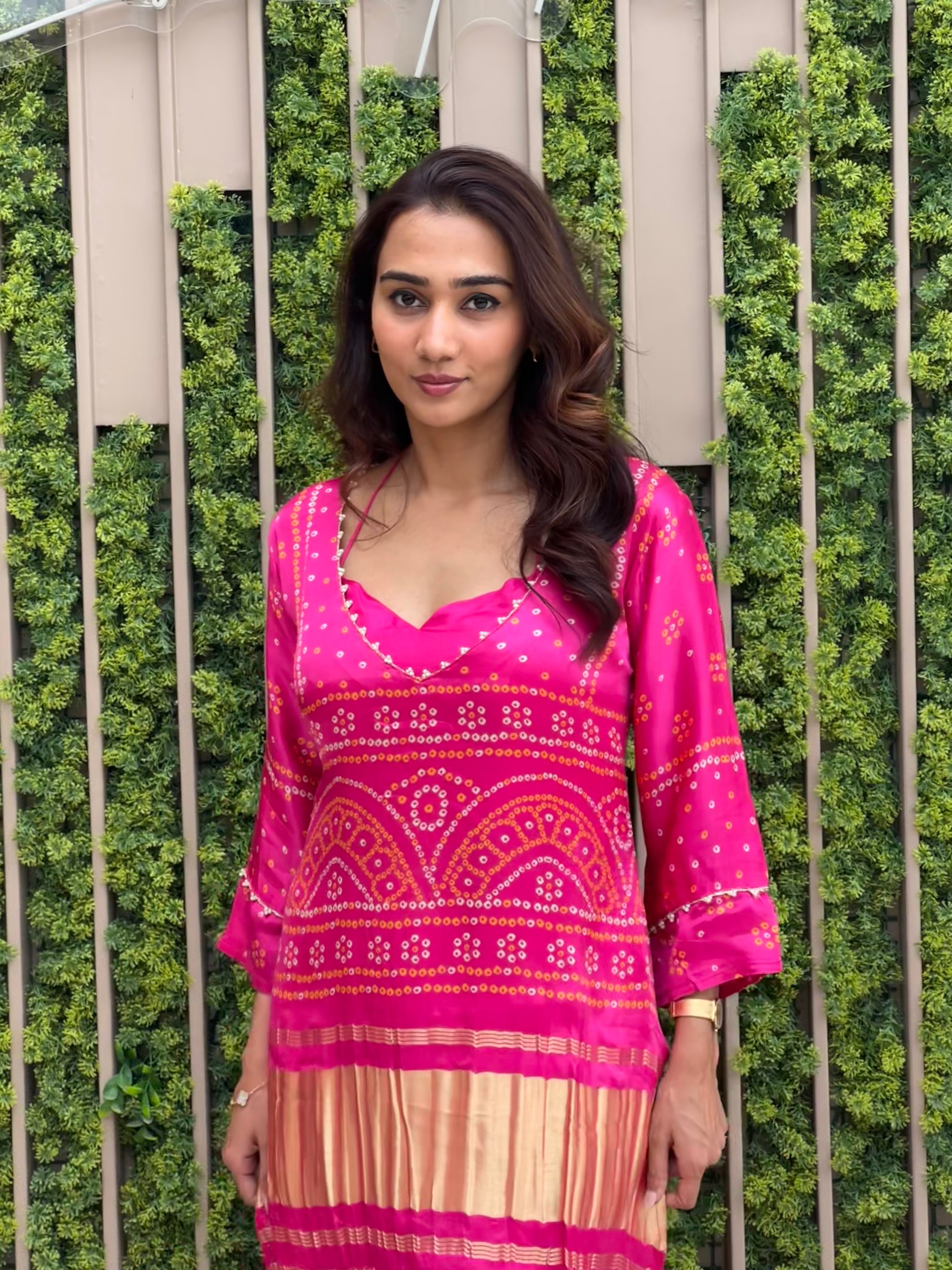 Vibrant fuchsia pink with golden detailing