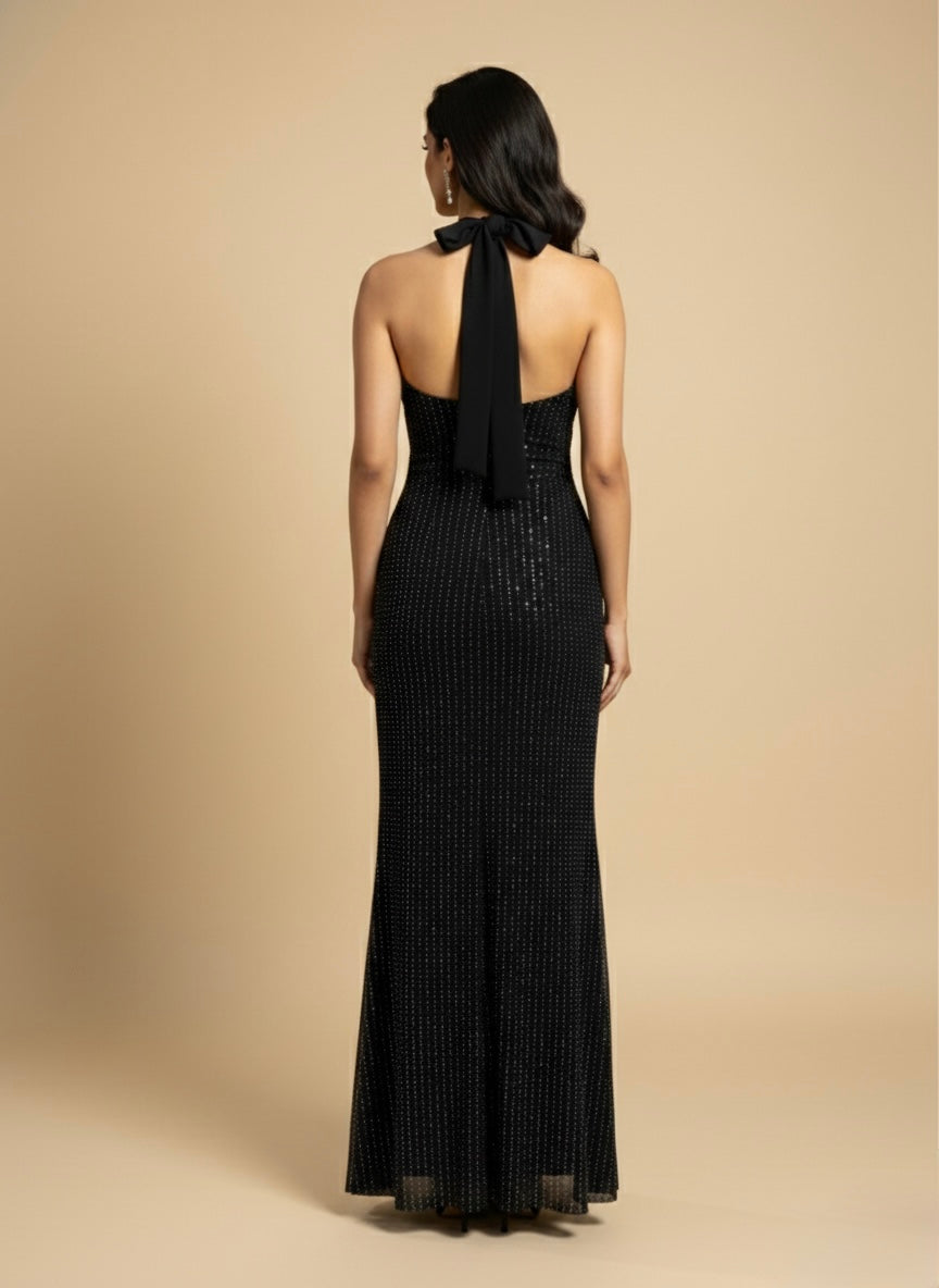 Dramatic Bow-Back Finish: The neckline transitions into a statement oversized bow at the nape, featuring long, flowing ties that cascade down an elegant open-back design.