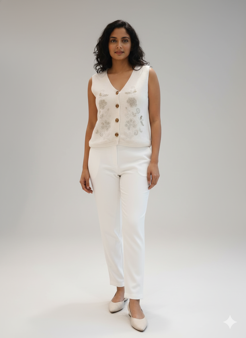 A dreamy blend of charm and comfort, the Snowglow Half Jacket features delicate floral embroidery on a soft knit base. This sleeveless button-down piece is designed to add a touch of sparkle to your winter layers, with subtle shimmer detailing that catches the light just right. Perfectly versatile, it pairs effortlessly with trousers or skirts for an elegant, elevated look.