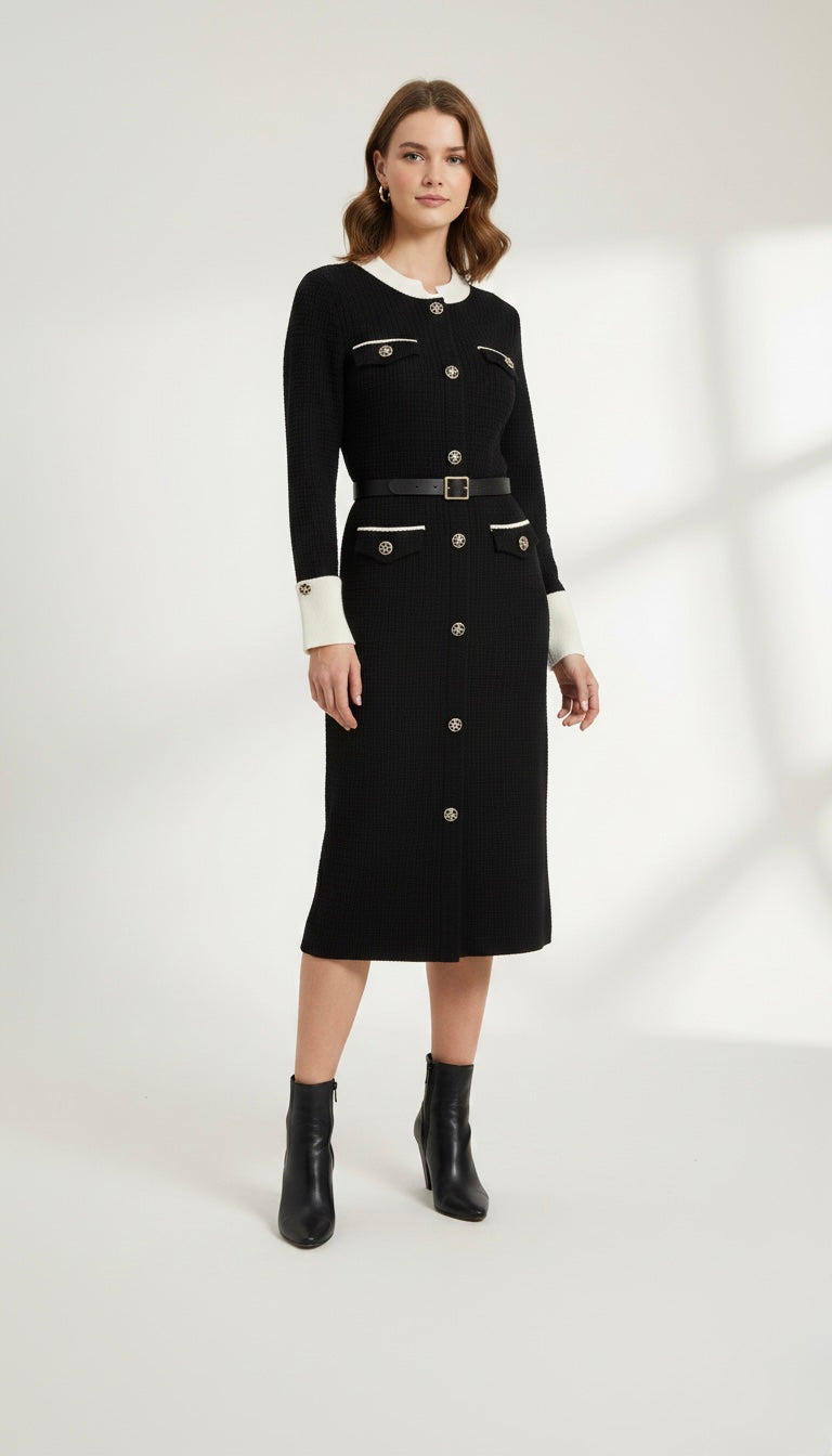 This tailored, long-sleeve midi dress features a refined, textured knit fabric that provides both structure and a luxurious feel. It boasts a full-length front button placket, accented with striking gold-tone buttons. The crew neckline, cuffs, and four functional flap pockets are highlighted with elegant contrast piping/trim, lending a polished, 'tweed-like' aesthetic. The set is completed with a chic, removable faux-leather belt that cinches the waist to create a flattering, structured silhouette.