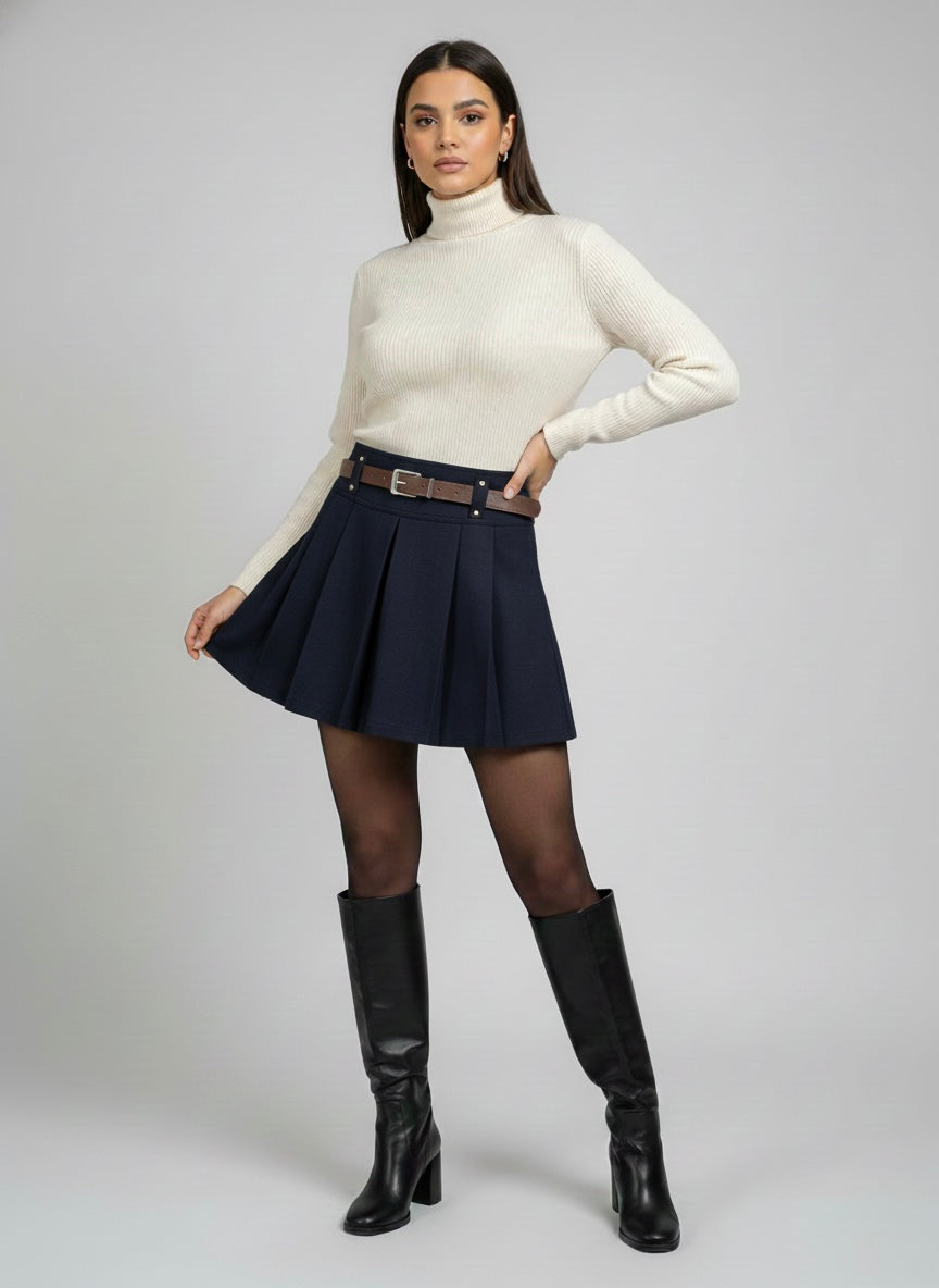 Twilight Sophisticate: Style the Midnight Obsidian (Navy) skort with a tucked-in silk blouse and sheer hosiery, allowing the sharp pleats to provide a structured contrast to fluid fabrics.