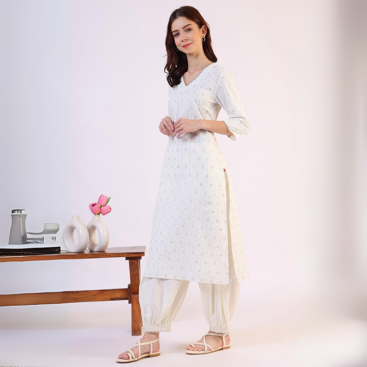 White Cotton Straight Kurta for Women with Geometric Design | KS-42